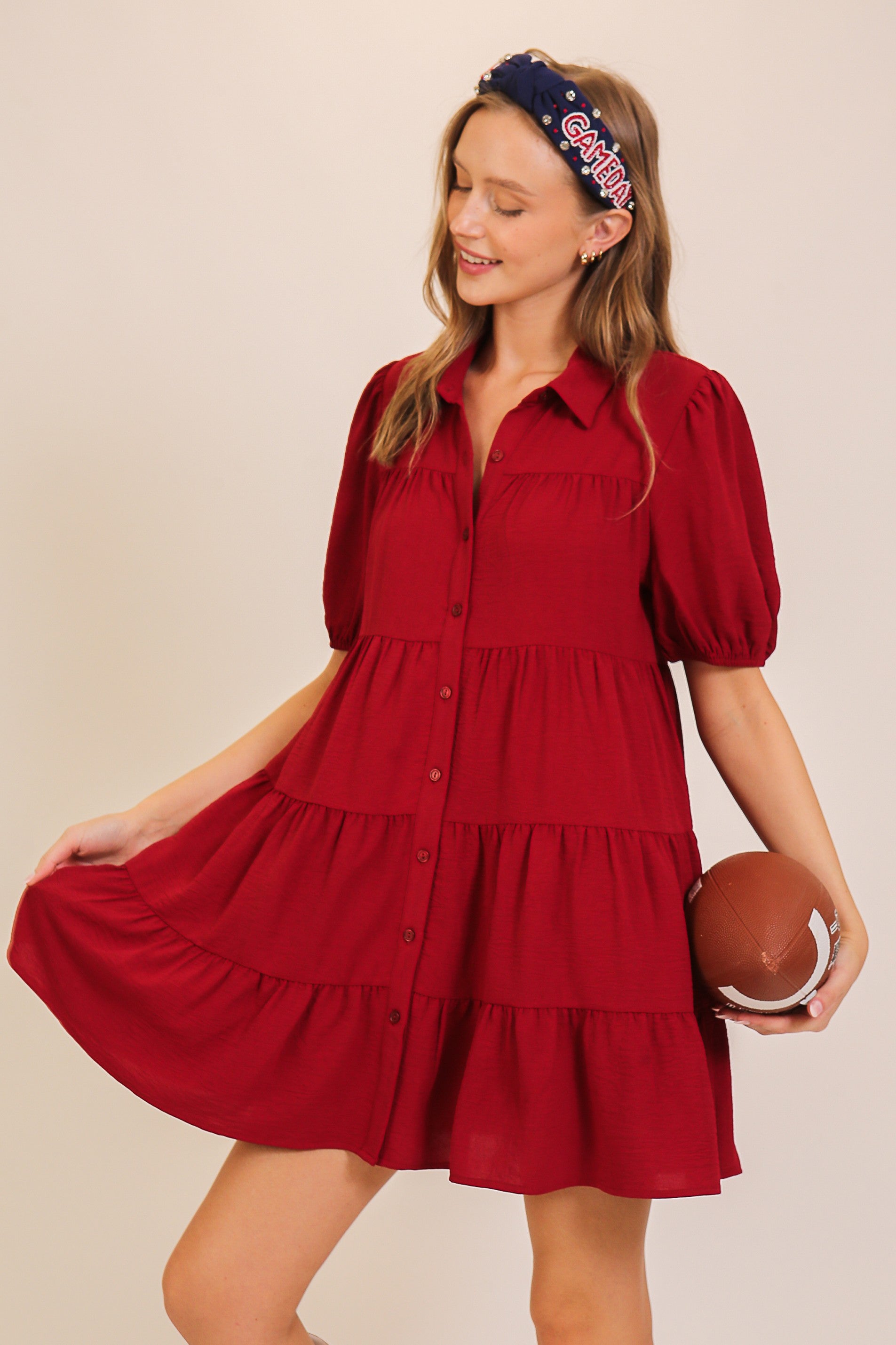Enjoy effortless style and comfort in this airy tiered dress made from lightweight airflow fabric. With its button-front design, chic collar, and fun puff sleeves, it brings a flirty and flexible vibe to your wardrobe. Ideal for casual hangouts, brunch with friends, game days, or sunny escapades.