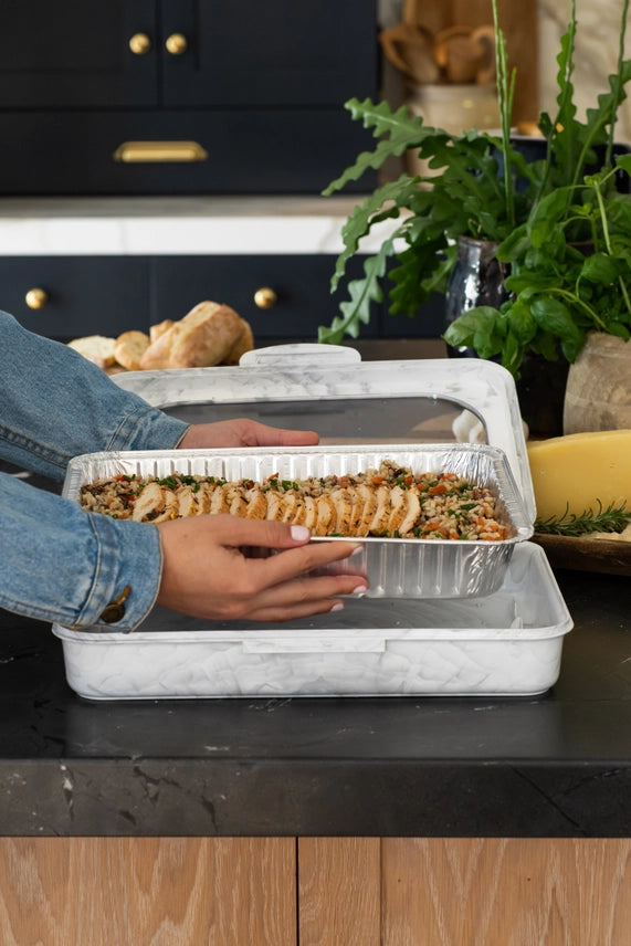 WHAT IS A FANCY PANZ®: Fancy Panz are used to dress up, protect and serve from a foil pan. Perfect for tailgating, potlucks, outdoor dining, picnics, home and more! WHAT'S INCLUDED: 1 removable clear top 1 9x13 foil pan 1 reusable serving spoon EASY TO USE: Open the frame, place your filled foil pan inside, and snap on the clear lid. Works with hot or cold food, straight from the oven or fridge. TWO WAYS TO SERVE: Use the clear lid as a trivet or keep it on to maintain food temperature and keep bugs out. EASY CLEANUP: Remove the foil pan and take your Fancy Panz home—leave the leftovers behind. IDEAL FOR TRAVEL: Stackable and sturdy, Fancy Panz prevent spills during transport. *All Fancy Panz are BPA-free, dishwasher safe, and proudly made in the USA!