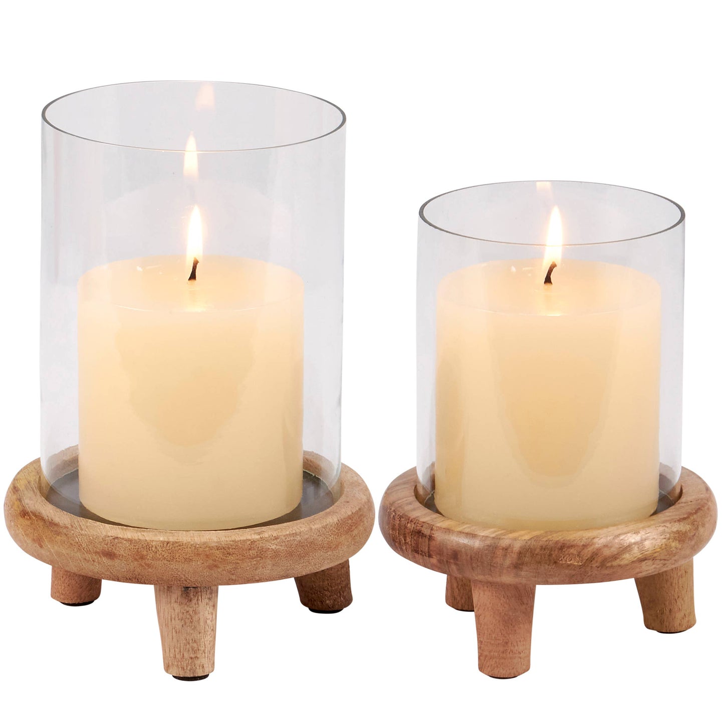 A set of 2 hurricane candle holders that coordinate well with décor from our Beach Collection. Each beach candle holder features a rustic wooden stand for the base to place a light source as well as a removable glass cylinder to place around candle. Our Hurricane candle holder set includes 2 different size holders that fit up to 4 inch pillar candles and 4.5 inch candles on the larger holder. Candles pictured not included. Candle holders free-stand on flat surface for display. A set of rustic beach-themed home accents perfect for adding natural lighting to any space.