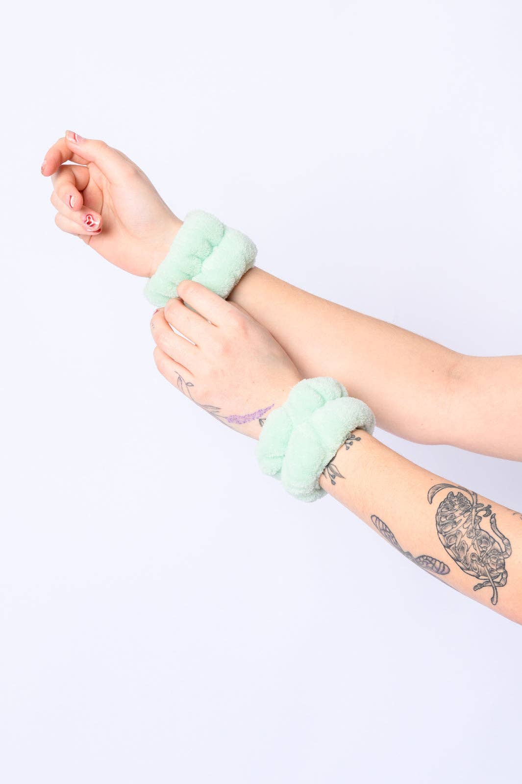 This trending braided sponge headband is covered in highly absorbent terry cloth to soak up moisture as you wash your face or apply your favorite skincare. Convenient wristbands catch drips from running down your arms!