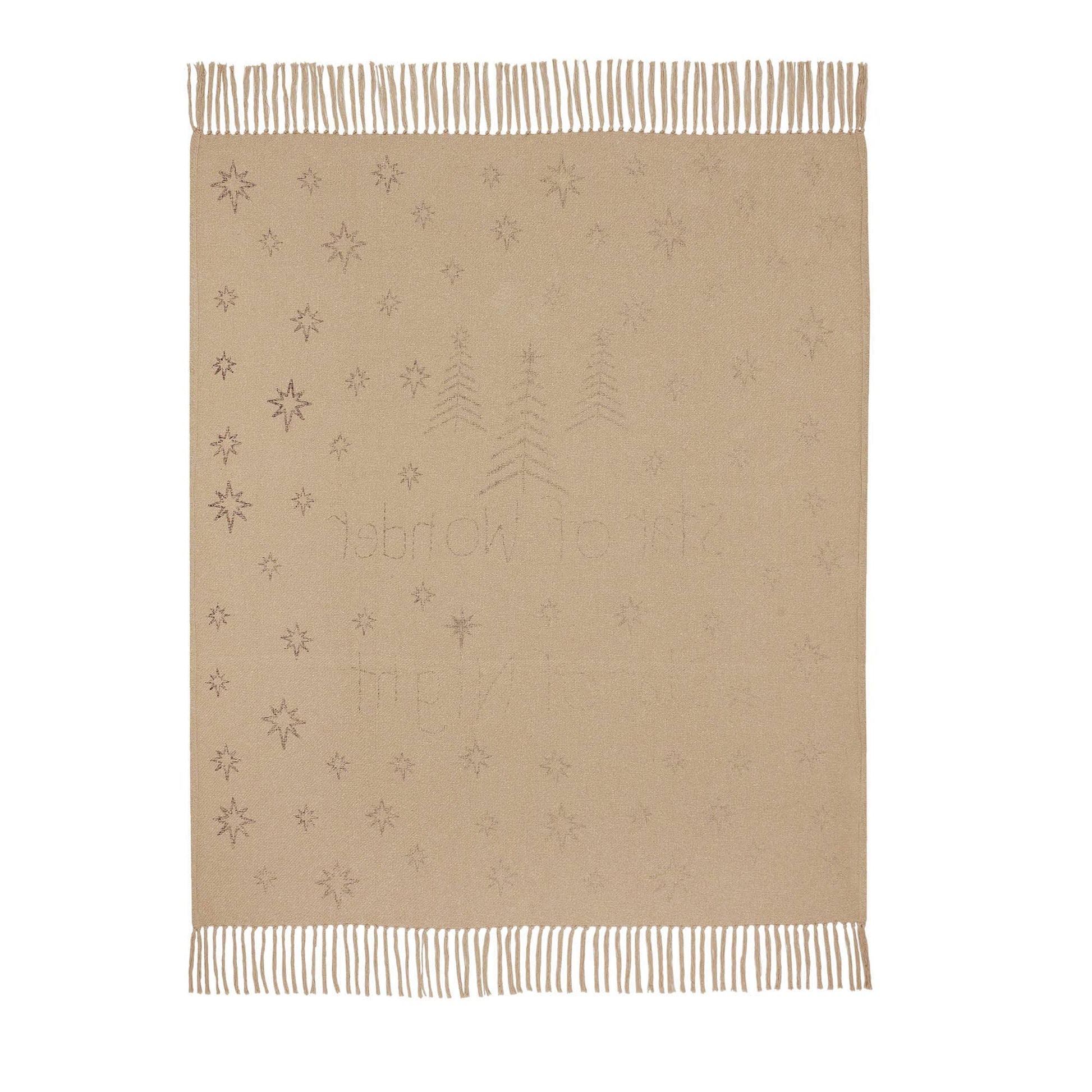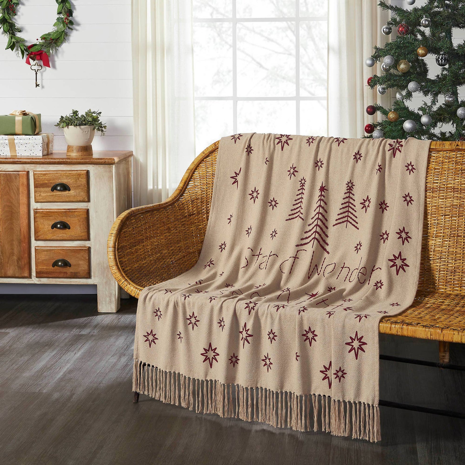 Wrap yourself in rustic charm with this delightful Star of Wonder Woven Throw! Measuring a generous 50x60 inches, this cozy blanket brings primitive country warmth to any room. The soft biscuit tan backdrop is beautifully accented with burgundy tones, while whimsical stars dance around a trio of Christmas trees and the heartwarming "Star of Wonder, Star of Night" text. Playful tasseled edges add just the right touch of texture and personality. Crafted from a durable 70% cotton and 30% polyester blend, it's easy to care for with machine washing and tumble dry low. Part of the Star of Wonder Collection by VHC, it's the perfect companion piece for creating that cozy lodge-inspired home you've been dreaming of.