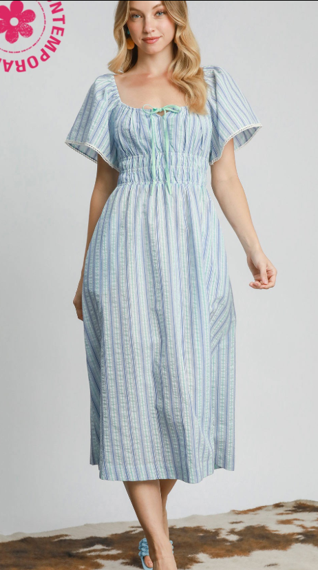 This Stripe Midi Dress features a flattering A-line shape with delicate lace trim, perfect for adding a flirty touch to your look. It’s unlined for a breezy feel. Our model, standing 5'9", wears a size small. Please note, all measurements are approximate. Crafted from a comfy blend of 50% cotton and 40% nylon.
