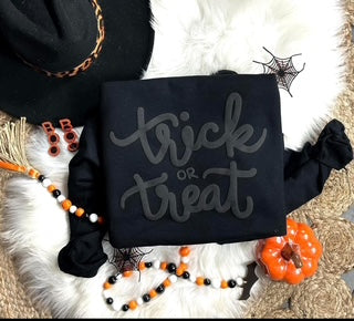 This Black on Black Trick or Treat sweatshirt, featuring a fun puff print, is your go-to choice for Halloween gatherings and spooky celebrations.