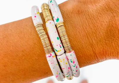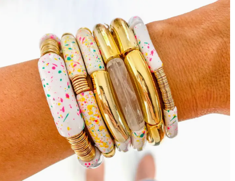 Add a pop of fun to your wrist with our White Confetti Speckle Acrylic Tube Bamboo Bracelet. These versatile bracelets are stretchy and can be mixed and matched to create unique looks. Made with high quality acrylic, they fit comfortably on a 7 inch wrist.